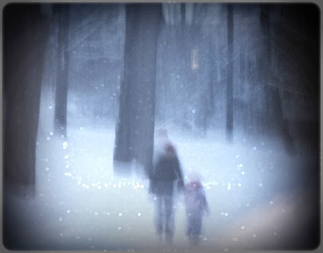 Okay, I may have watched too much Narnia this week, but I love this photo. Truly. And that's all that counts, right? ☺ It's atmospheric, double exposurery, has a bit of added bokeh, and a light in a far window. I took this during a snowstorm as I watched my daughter's friend and her little daughter walk down the street toward home. I felt conflicted about taking the photo without this gal's permission, too. A couple of years ago, I told her all about it and she actually gave me permission to use it. Phew. No guilt.